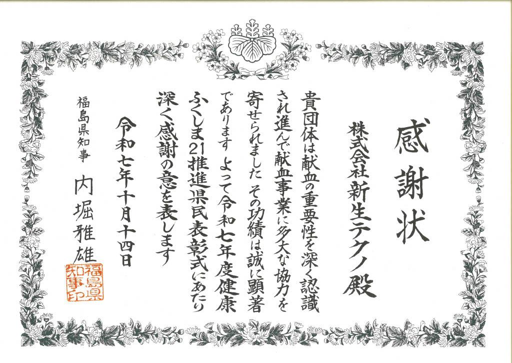 福島県より感謝状を贈呈いただきました 2025-11-19 最終更新日時 : 2025-11-19 sinsei-techno 令和7年度10月14日 福島県知事 内堀雅雄様 より令和7年度健康ふくしま21推進県民表彰式にて献血活動を評価されて感謝状を贈呈いただきました。